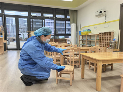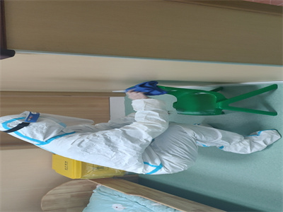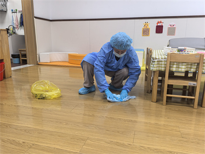 班级保育老师在幼儿出现呕吐症状后,立即穿戴好防护服进行清理、消毒。