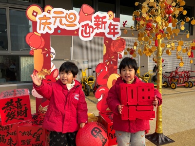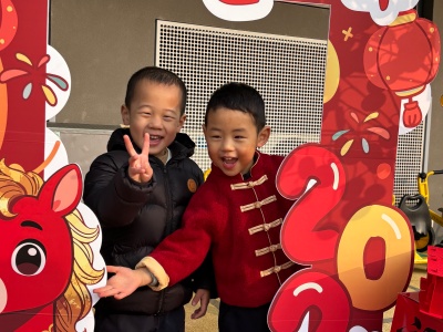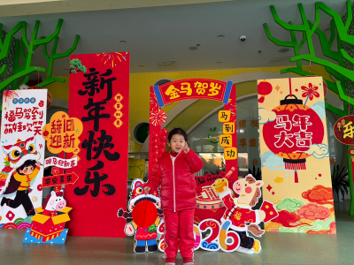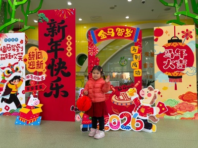 为了留住宝贝们的马年专属回忆,育儿园精心布置了马年主题打卡区!红彤彤的背景板上写着 “2026 金马贺岁 新年快乐”,搭配可爱的卡通小马玩偶、缤纷气球与喜庆中国结,瞬间点燃了孩子们的打卡热情。
