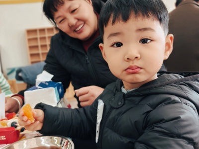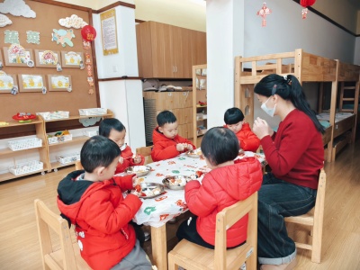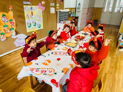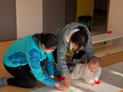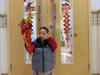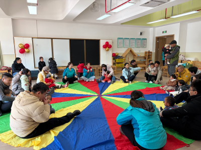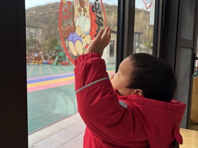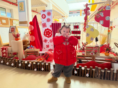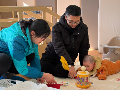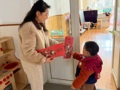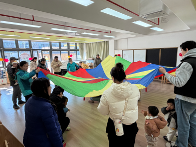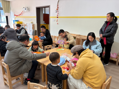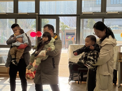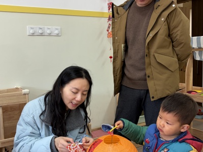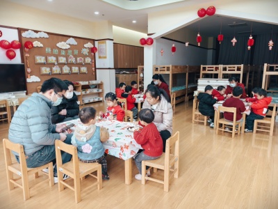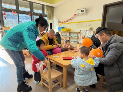 13-24 月龄的托小班宝贝则分为小象班和小鹿班开启专属体验。小象班的宝贝们跟着老师跳起欢快律动,随着音乐摇摆身体,尽情释放活力;小鹿班的灯笼 DIY 环节创意满满,家长协助宝贝用预裁好的红色卡纸灯笼和卡通贴纸装饰,一个个独一无二的元旦灯笼在小手间诞生。工作人员全程温和引导,用专业的回应性照护,让宝贝们在安全包容的氛围中大胆探索。