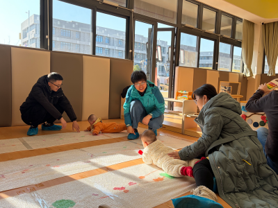 对于 0-12 月龄的乳儿班萌宝,“彩球迎新” 活动趣味十足!工作人员引导家长用色彩鲜艳、材质安全的充气彩球、毛绒小球轻触宝宝手脚与腹部,温柔刺激宝贝的感知觉发展;宝贝们努力抓握、拍打彩球,在玩乐中锻炼手部力量。地面涂鸦环节更是欢乐不断,家长们耐心辅助宝宝爬行或坐立拍打颜料,在色彩挥洒中锻炼宝贝的四肢力量与身体平衡感,每一处涂鸦都是萌宝们对新年的独特表达。